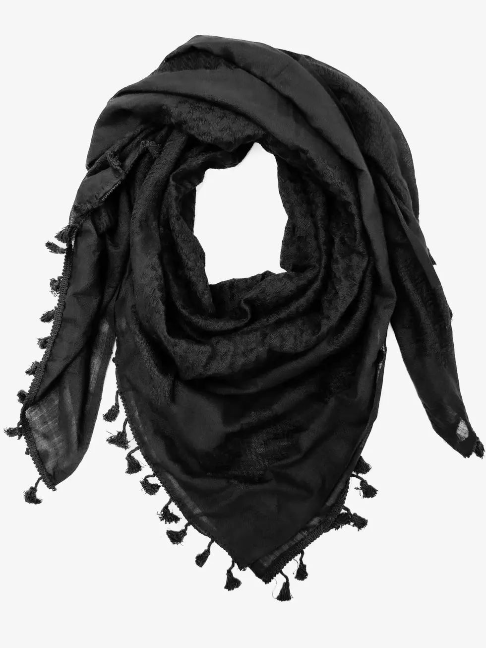 Show off our Pure Black Hirbawi® Kufiya, made in Palestine. This timeless accessory features an all-black pattern and delicate lace, reminiscent of the classic headdress worn by shepherds in the Middle East. Wrap yourself in the heritage and elegance of the region with this authentic and stylish Kufiya.