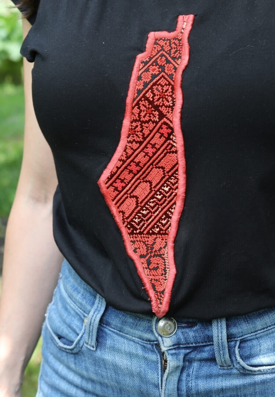 A handmade map of Palestine embroidered from vintage Palestinian tatreez fabric on a medium weight tee. Wearing this tee directly supports a woman-owned business and honors a centuries-old symbol of Palestinian resilience and strength.